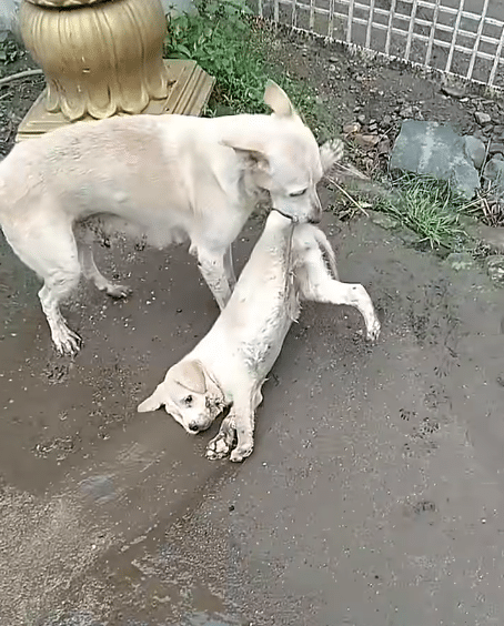 The video opens on a simple, tender moment. On damp ground, a white mother dog stands close to her puppy, nudging him gently, encouraging him to rise. The little one remains still, tired or perhaps simply unwilling to move, trusting his mother to watch over him.