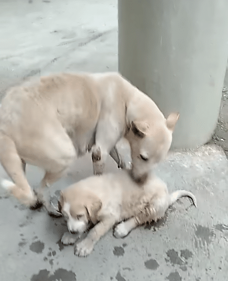 At last, the mother reaches a clean, dry brick-paved area. She lowers her puppy carefully and immediately begins to check him—licking his fur, cleaning him, reassuring him with familiar touches.