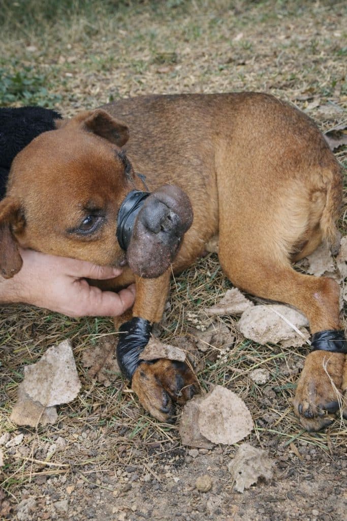 She could barely move. Her breathing was shallow and labored. Electrical tape had been tightly wrapped around her muzzle and paws, leaving her immobilized and in visible distress. Her body was swollen, her strength nearly gone, and each breath seemed like an effort she might not be able to repeat.