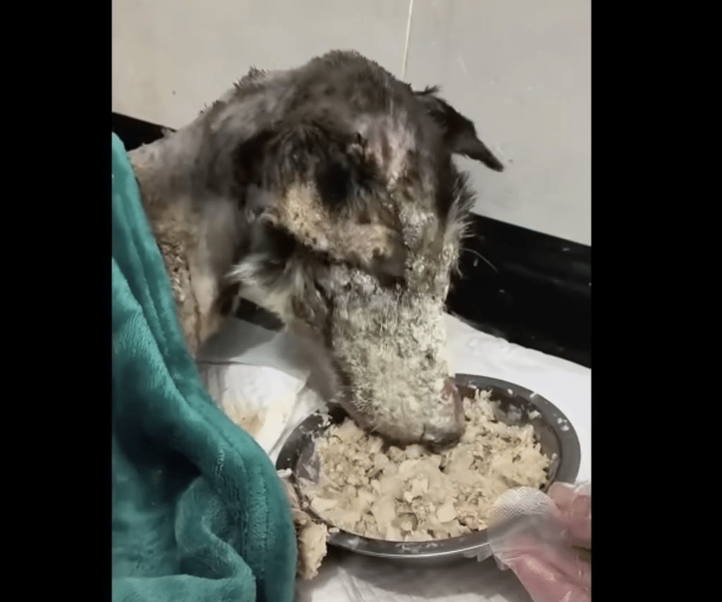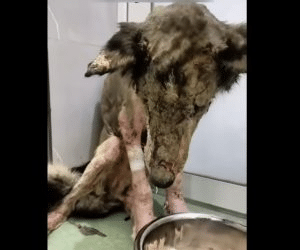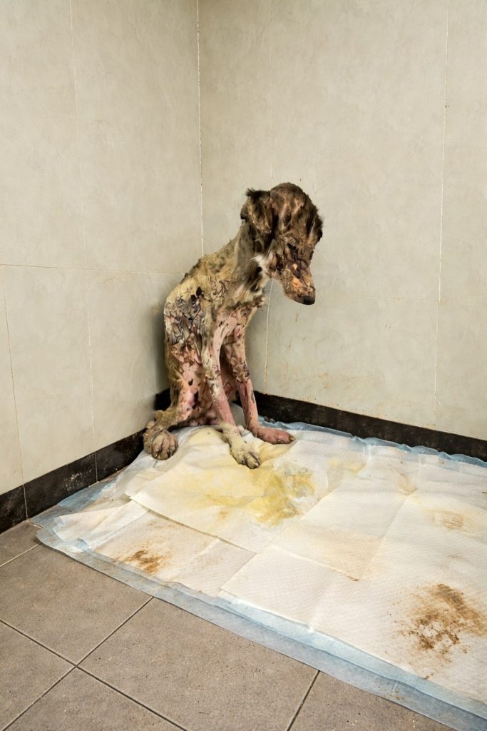 Shua’s condition told a story of prolonged neglect. He was severely dehydrated and weak, his body struggling to support itself. Large areas of his fur were gone, leaving behind inflamed, sensitive skin that reacted painfully to even the slightest touch. What made it more heartbreaking was that Shua was already indoors—yet even there, he did not feel safe. His body remained tense, his movements cautious, as if walls and shelter offered no real protection.