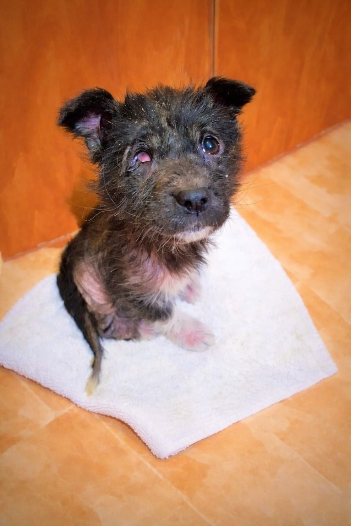 When rescuers finally found Yaska, her condition spoke volumes. She was dangerously underweight, her small body tense from weeks spent surviving on instinct alone. Large patches of her skin were inflamed and raw, much of her fur gone. One eye had been lost long before help arrived, and the surrounding area showed signs of ongoing infection.
