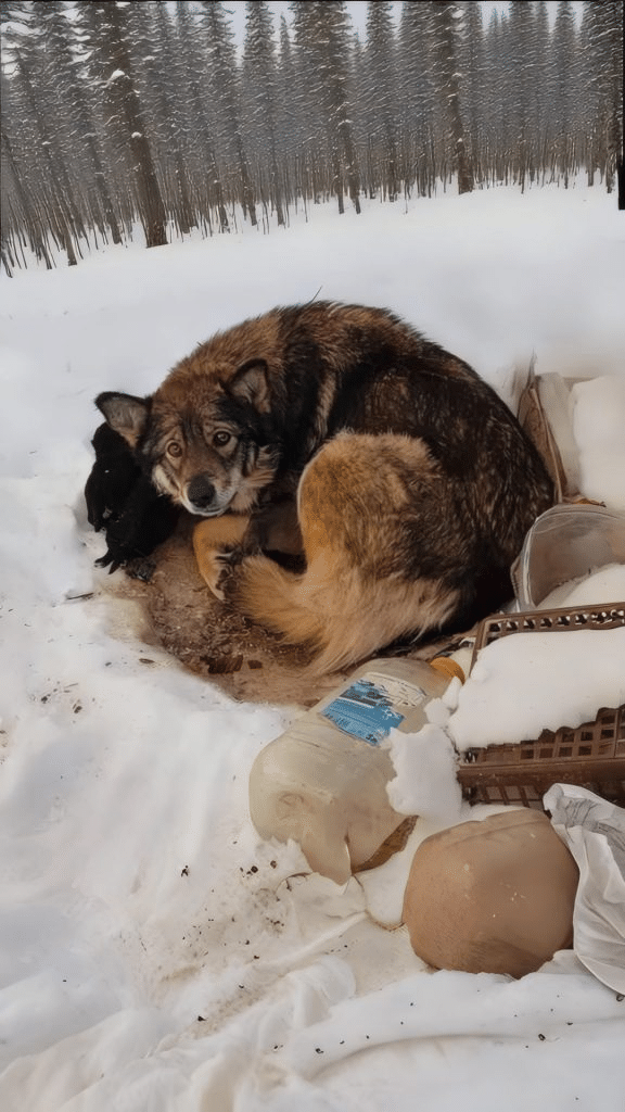 There, tucked into a shallow nest in the snow, was a mother dog. Her body trembled with exhaustion and cold. Frost clung to her fur. Her breathing was faint. And beneath her, curled tightly against her fragile frame, were tiny newborn puppies. She had given birth directly on the frozen ground with no shelter, no warmth, and no protection from the harsh winter air.