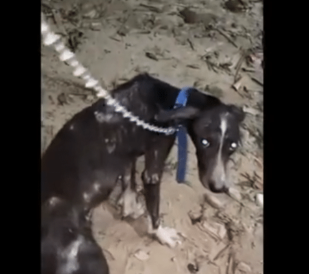 Tethered in place and barely able to move freely, his body showed weeks of struggle. He was dangerously thin, weak, and exhausted. When he lifted his voice, it wasn’t loud or demanding. It was tired. Gentle. Almost apologetic.