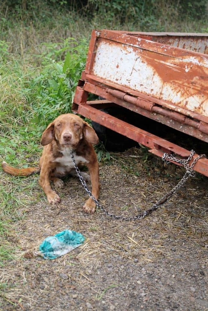 When the team arrived, the reality was heartbreaking. The dog was still chained in place, unable to move freely. His legs showed clear signs of old injuries that had healed poorly, leaving him in constant discomfort. Even shifting his weight seemed difficult.