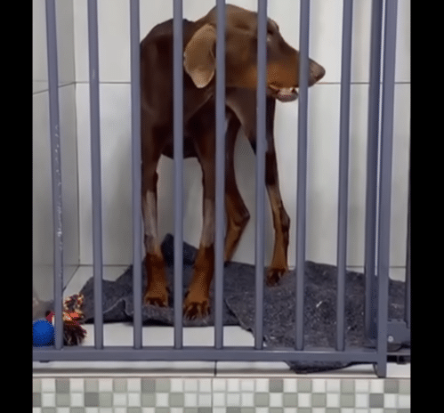 The rescue began in silence, inside a pet shop that had long been abandoned. The building was empty, dusty, and filled with the echo of neglect. It was only after rescuers followed faint cries for help that they realized someone was still there. Inside, they found a Doberman chained tightly to a post. His body was painfully thin, reduced almost to skin and bone. He could not stand. He did not try to move. It was as if he had already accepted that no one was coming.