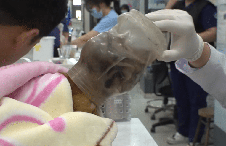At the clinic, veterinarians worked gently and methodically. Cutting away the hard plastic container required extreme care to avoid injuring his neck. When it was finally removed, the reality of his condition became clear. He was severely dehydrated, and his kidney levels were dangerously high from prolonged lack of water. Doctors noted that surviving so long under those conditions was nothing short of remarkable.
