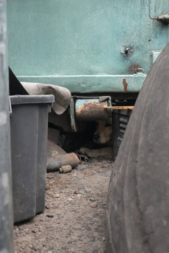 As the rescuers approached, a freight train thundered past nearby. The sudden noise sent the dog into panic. In seconds, she bolted and disappeared beneath a massive container trailer, hiding among old tires and scattered debris. The space beneath the trailer was low, dark, and dangerously cramped, making the rescue far more complicated than expected.