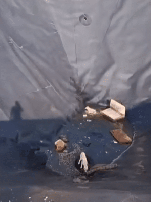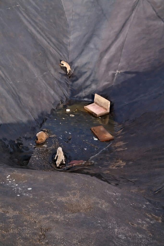 In the village of Yohmor, Lebanon, a massive artificial water reservoir became the setting for an unthinkable scene. At the bottom of the deep concrete basin, two animals were found trapped—a dog and a fox. The reservoir was lined with slick black plastic, its steep walls impossible to climb. Below, icy water pooled around floating debris. With no escape, the two animals huddled together on a torn mattress, trembling in the cold.