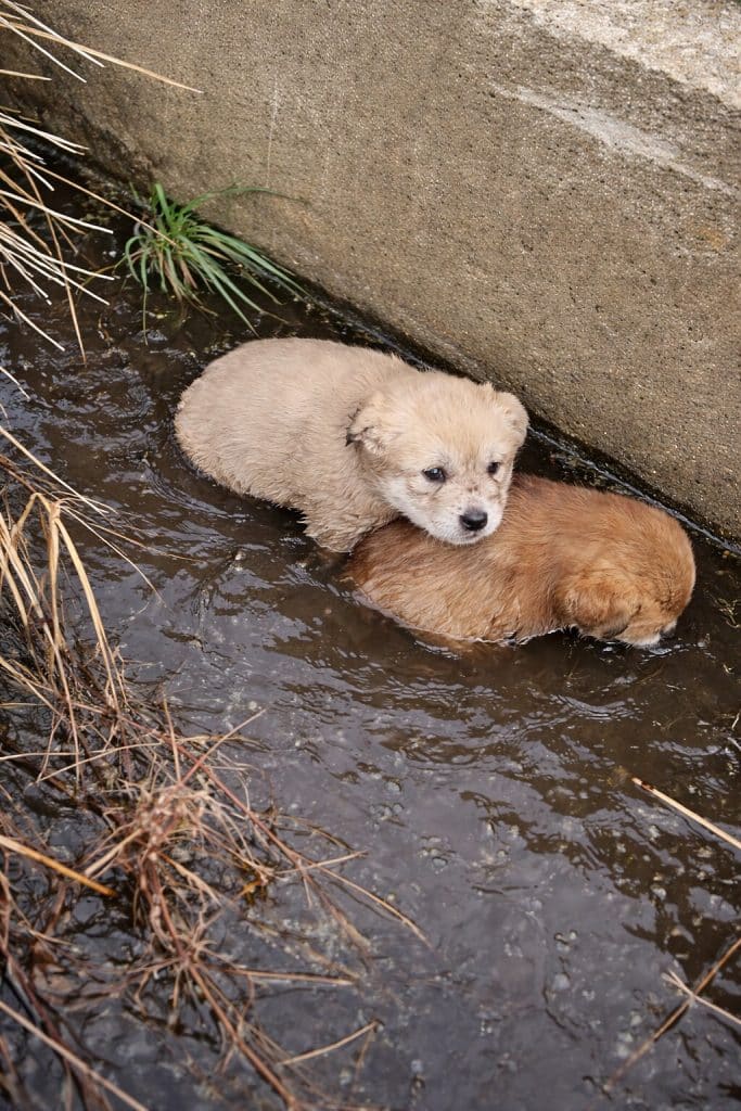 Video: Two Tiny Puppies Trapped in a Cold Canal Finally Brought Into Warm Arms