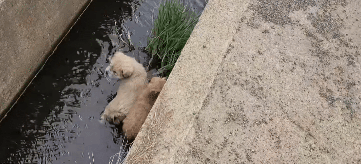 In a narrow, deep drainage canal, two tiny puppies—one soft brown, the other pale golden—were trapped. The walls were steep and slick. The water was shallow but cold. No matter how hard they tried, their tiny paws couldn’t find a grip.