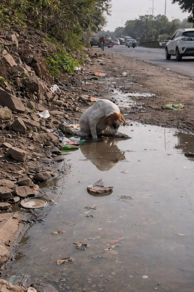 His body looked exhausted, his eyes distant. The muddy water had soaked into his fur, and bits of roadside debris clung to him. He seemed trapped in place — not by walls, but by something far heavier.