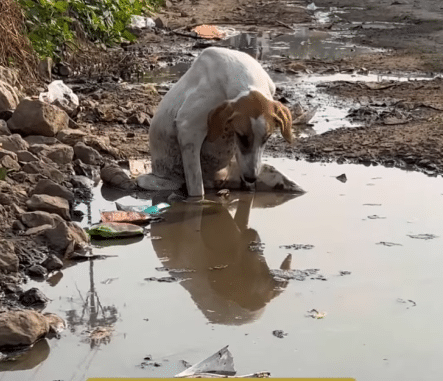 And there, beside the busy road, in a shallow puddle of muddy water, a white dog with brown patches sat completely still.