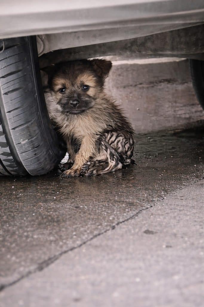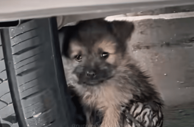 On a rainy, bitterly cold day, a very small puppy curled himself beneath a parked car, trying to stay dry.