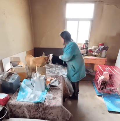 A few steps further, she introduces another resident — a black-and-white dog who cannot use his hind legs. He was found after lying in the snow for four long days following a traffic accident. Cold. Weak. Waiting.