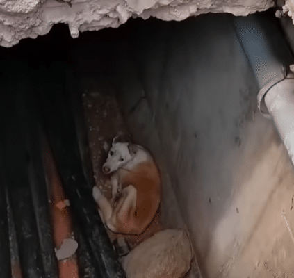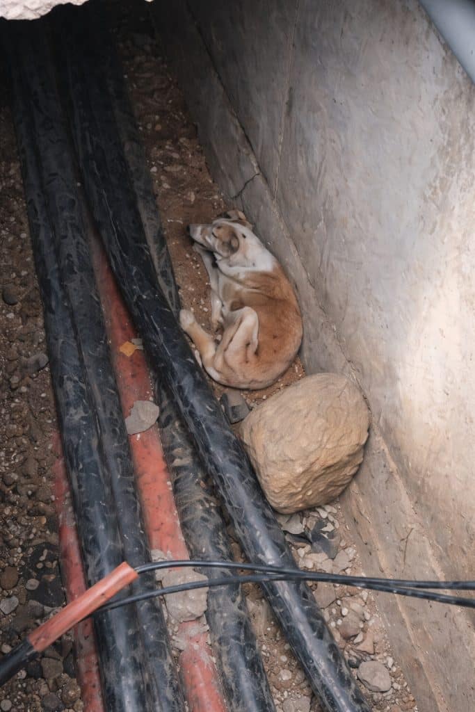 A large stone had been placed over the opening, a makeshift warning sign. But by the time anyone realized what had happened, the little dog was already deep inside a narrow underground cable trench, unable to climb back up.