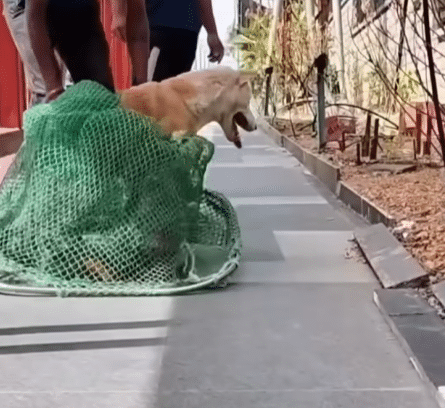 The rescuers carefully placed him into a large green net, ensuring he would be secure during the lift. Above ground, two men worked together with rope and pole, slowly raising the net from the depths.