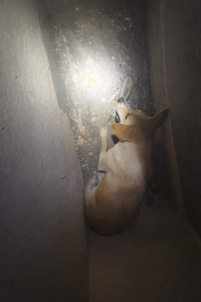 It was a cramped, dusty gap filled with metal brackets and pipes — a place no animal should have to hide.