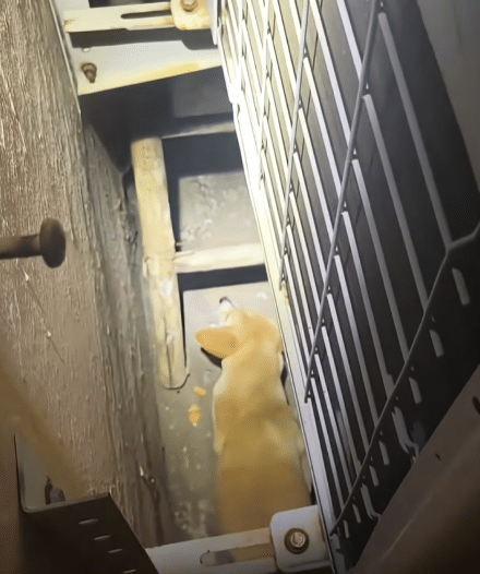 As a rescuer carefully climbed up using a ladder, carrying a specialized net pole, the frightened dog retreated even further. In his panic, he squeezed into a tight space between the wall and several large industrial air-conditioning units.