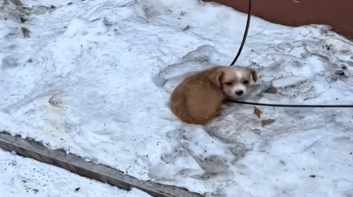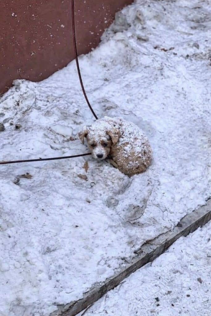 Her body trembled uncontrollably. Each breath formed a faint cloud in the icy air. She had tucked her nose beneath her tail as if trying to disappear from the world — or perhaps simply trying to survive another minute.