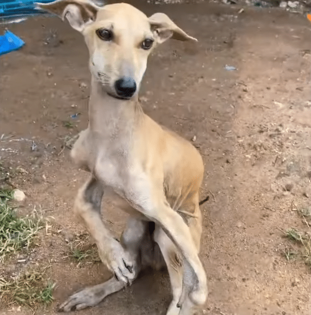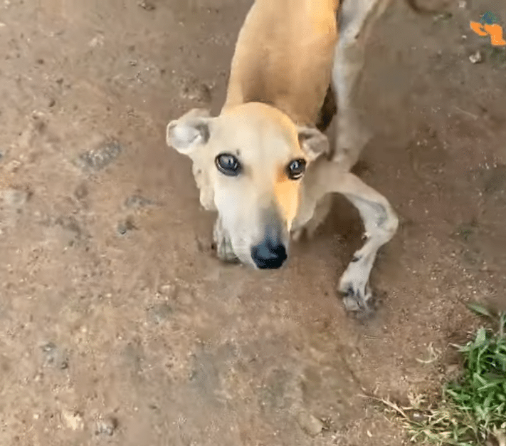 He was painfully thin, his ribs visible beneath a dull coat. His body showed the signs of prolonged malnutrition, and every step seemed like a struggle.