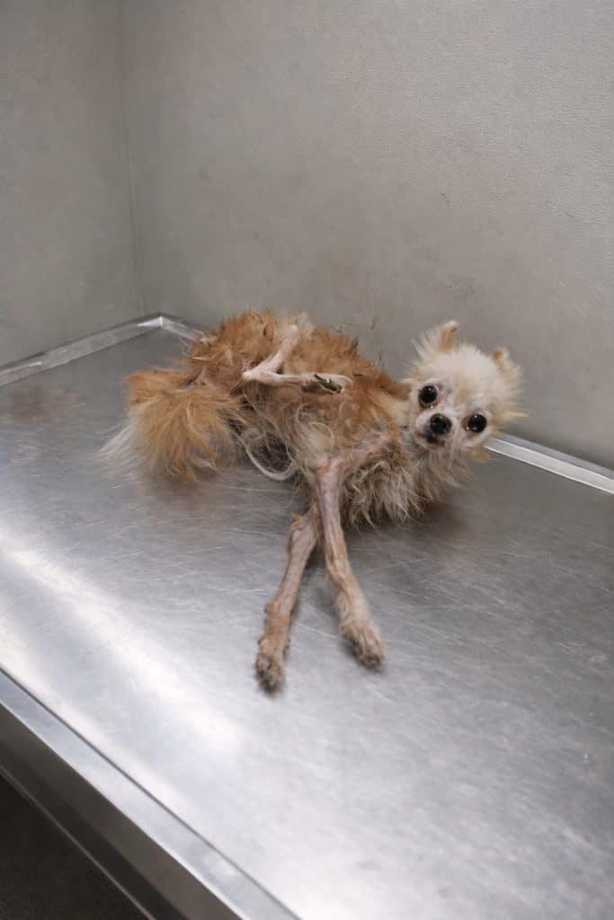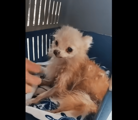 He was painfully thin — so fragile that every rib and vertebra was visible beneath his skin. His coat was matted and dirty, clinging unevenly to a body that had long gone without proper care.