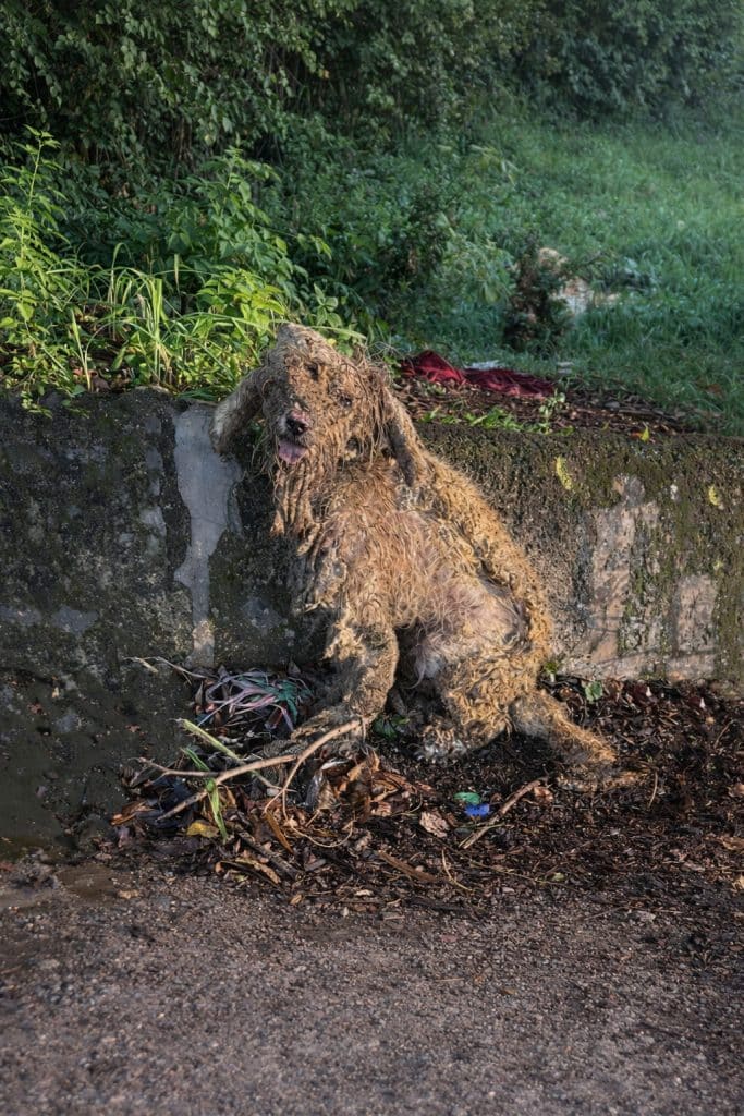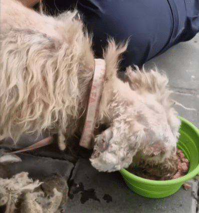 Beneath the layers of matted fur, there were parasites — fire ants, lice — clinging to her weakened body. The coat itself had hardened over time, forming thick clumps described by rescuers as “like stone.”
