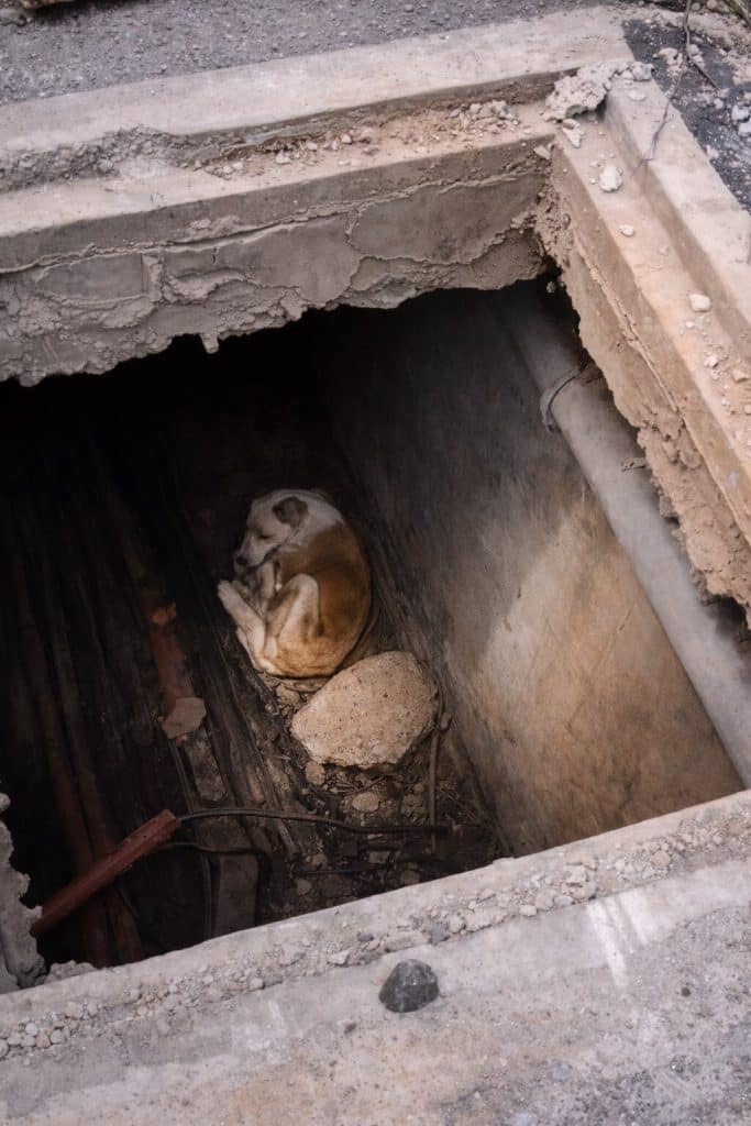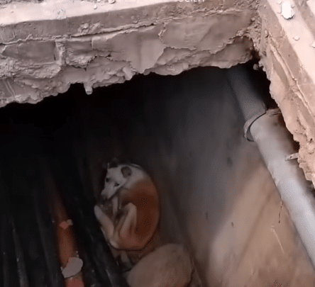 A dog had slipped into a narrow electrical drainage trench — the kind built only for cables and pipes, not for living beings. The space was deep and confined, lined with large utility conduits that were slick and difficult to grip.