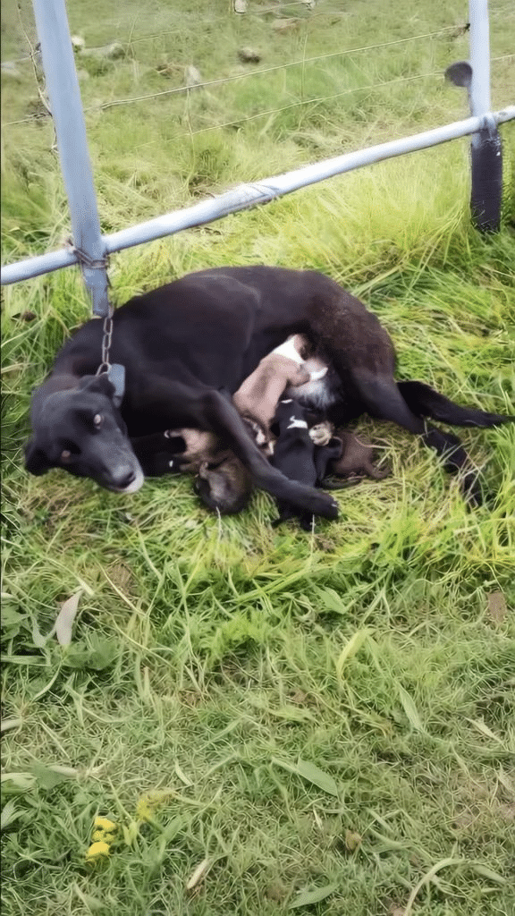 There, tethered tightly to a cold metal pole, was a young lurcher barely two years old. The chain around her kept her within only a few inches of movement. She was thin, tired, and clearly worn down by long hours exposed to the elements. Yet despite her impossible situation, her focus remained steady—not on her own discomfort, but on the six tiny puppies pressed closely against her side.