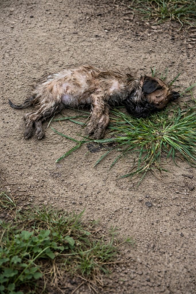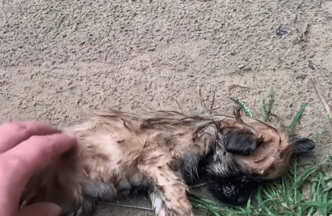 Between the mud and tangled grass lay a tiny long-haired puppy, soaked through and covered in dirt. His small body was limp, his fur clinging to him in heavy, wet strands. He didn’t move.
