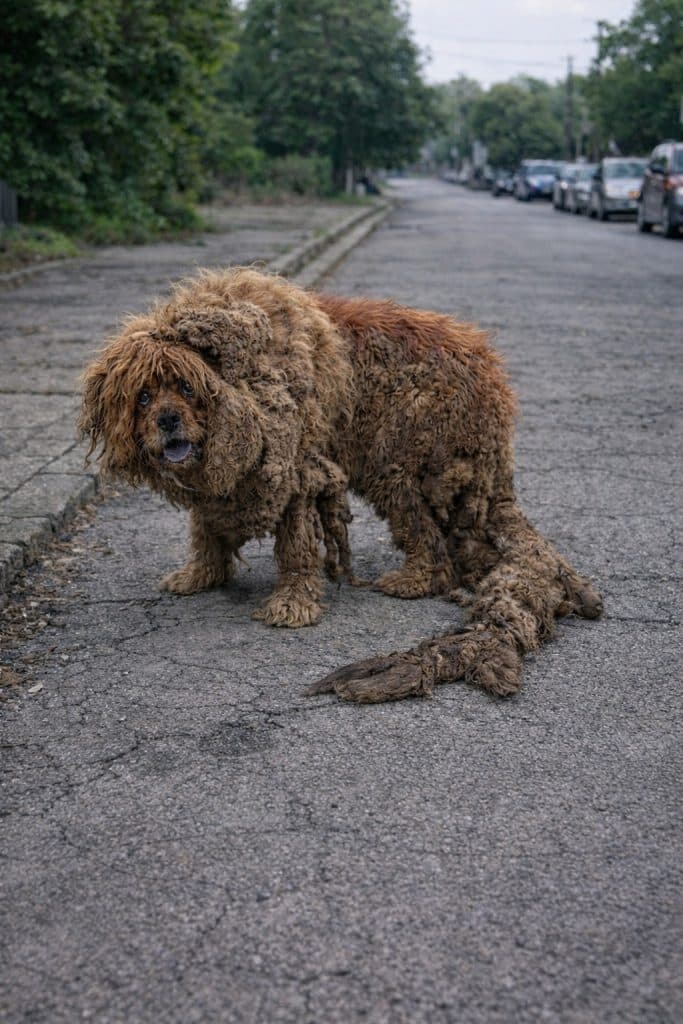 Her once-thick coat had hardened into heavy mats that clung to her body like armor. Dirt, mud, and parasites were tangled deep within it. Every step must have felt like dragging the past behind her. And yet, even in that fragile state, she did not growl or resist. She simply waited.