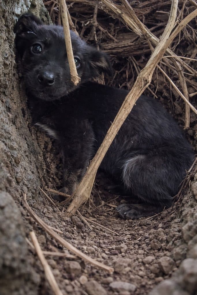 Beneath a cluster of dry branches and brittle leaves, a tiny black puppy pressed herself into the earth, trying to disappear. Her body was still, but her eyes were wide — watching every movement from a distance.