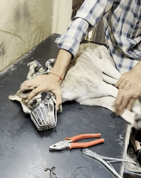 He was rushed to a veterinary clinic, where the team worked carefully and calmly. For everyone’s safety — including his own — a soft muzzle was placed during the examination. Pain can make even the gentlest animal react defensively.