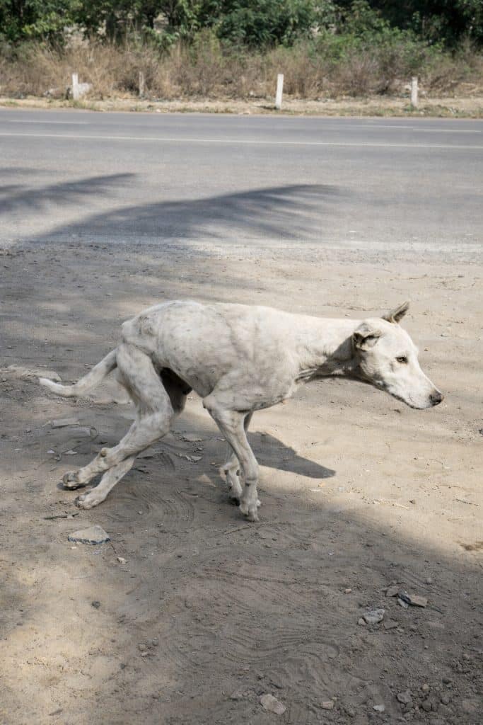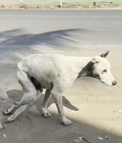A white dog with small black patches dragged the lower half of his body across the pavement, his front legs doing all the work. His back legs no longer supported him. An accident, according to local residents, had changed his life in an instant.