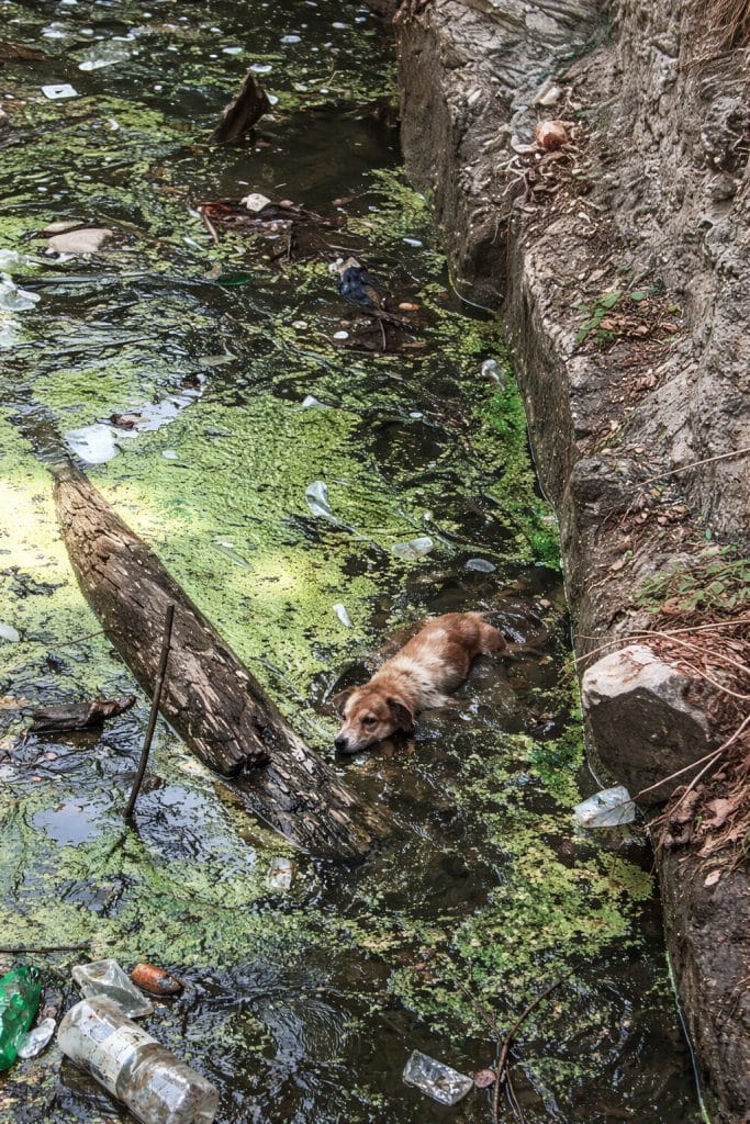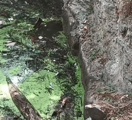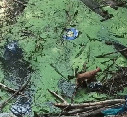 When local residents leaned over the edge, their hearts sank. At the bottom, beneath layers of stagnant green water and floating debris, a stray community dog clung to a narrow ledge carved into the stone wall.