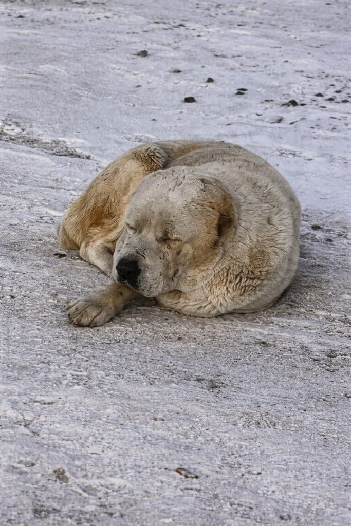 At first glance, he appears powerful—his size and build resemble a Central Asian Shepherd. But nothing about his posture speaks of strength. He looks defeated, as if the cold has seeped into places far deeper than his bones.