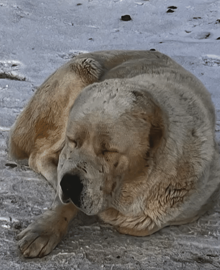 Against a backdrop of frozen ground and biting wind, a large white dog lies curled tightly into himself. Snow presses against his fur. His body barely moves. His eyes hold exhaustion, sadness, and a loneliness that feels heavy even through the screen.