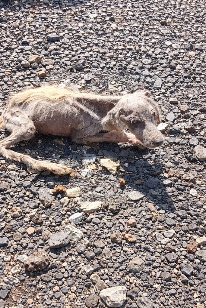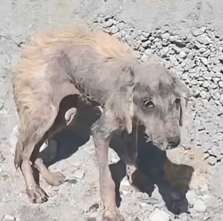 He was found on a dry, rocky patch of land—curled beneath a parked vehicle, trying to make himself invisible. His body was so thin that every rib pressed sharply against fragile skin. His spine rose like a ridge beneath what should have been fur.