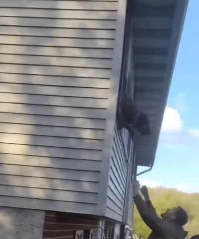 Then he landed safely in the arms waiting below.