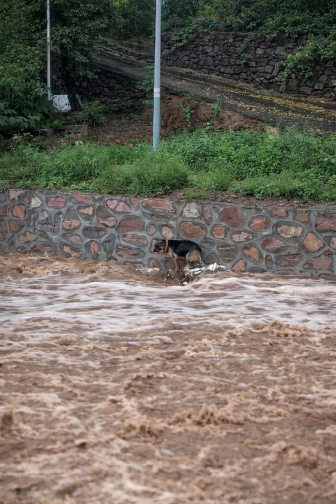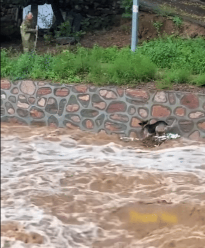 And on a narrow ledge just inches above that raging water stood a small dog.
