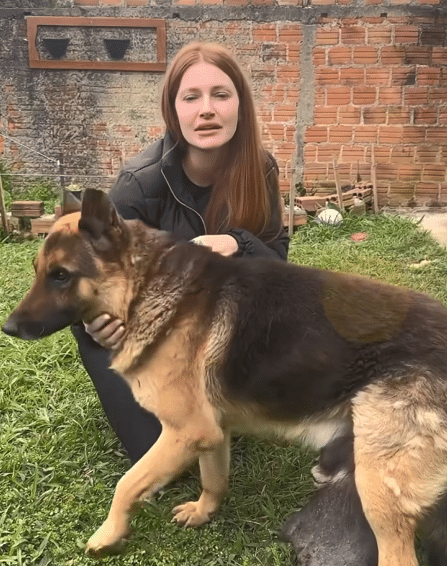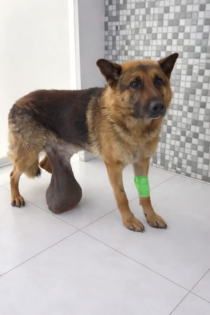 A once-proud German Shepherd struggled to move across the ground. Hanging between his hind legs was an enormous tumor—nearly eight inches long, swinging painfully with every step. It dragged against the ground, reopening wounds and leaving traces of blood behind him.