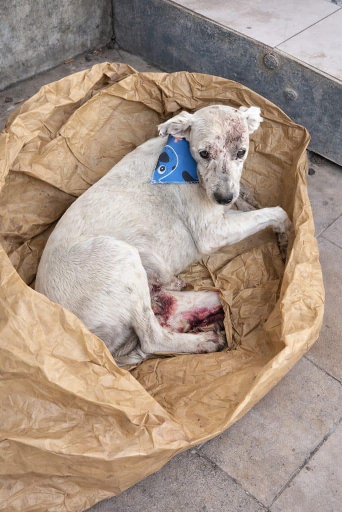 Missô cried softly during the drive. When he arrived, strong pain relief was administered immediately. He was running a high fever, his body shivering from shock. For his own safety and the staff’s protection, a muzzle was gently placed while they cleaned his wounds.