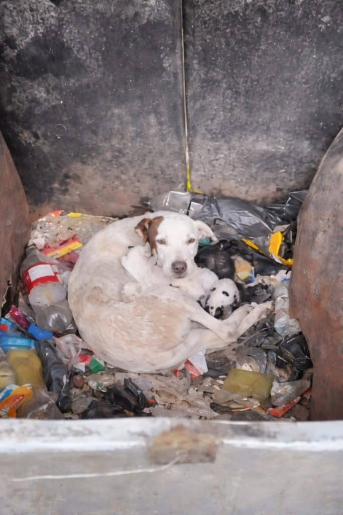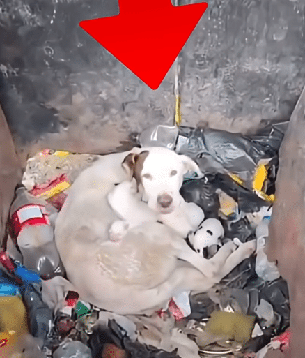 She had just given birth when someone left her beside a trash container in the freezing cold. The box was thin. The wind was sharp. Inside, tiny newborn puppies pressed themselves against their mother, unaware of how fragile their first hours of life truly were.