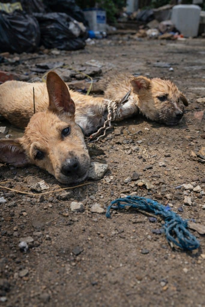 The puppies were thin. Their fur was matted with mud and dirt. A short chain bound them close, limiting even the smallest movement.