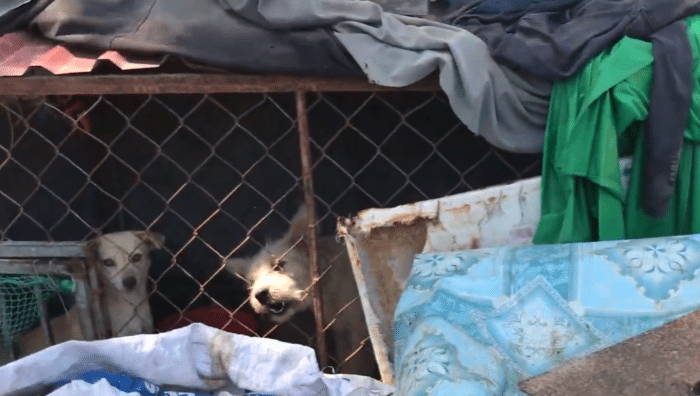 When the rescue team arrived, they found rows of old metal cages pressed tightly together in a yard cluttered with debris. The air felt heavy. The ground was damp and littered with refuse.
