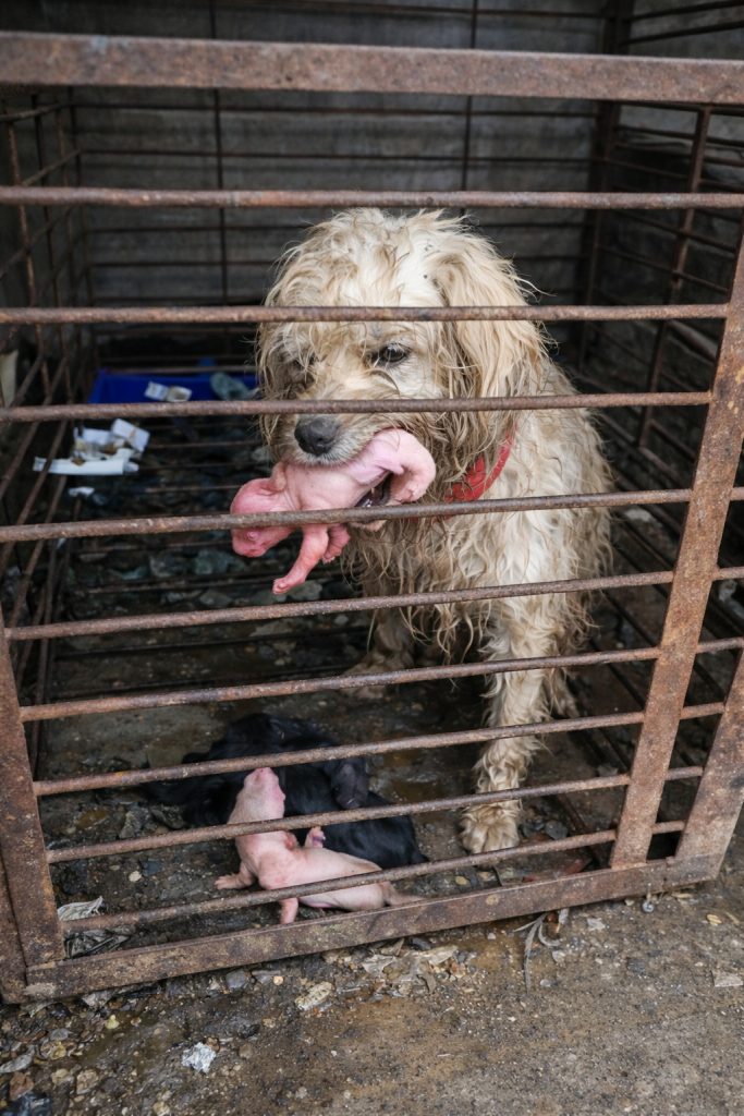 She gently picked up her newborn puppy and pushed it toward the gap in the metal bars.