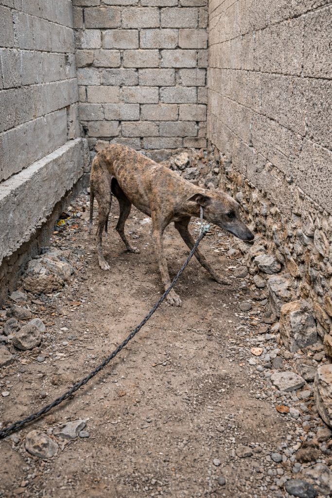 When the team arrived, they found him chained against a filthy wall, surrounded by trash and debris. His body was painfully thin. His fur dull. His eyes lowered.