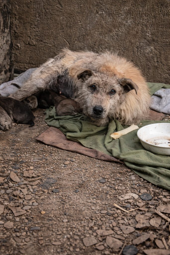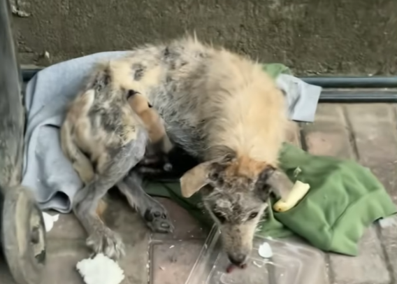 She was painfully thin. Much of her fur had fallen out due to severe skin disease. Her body looked exhausted from both illness and childbirth. Yet beside her lay tiny newborns, pressed close for warmth.