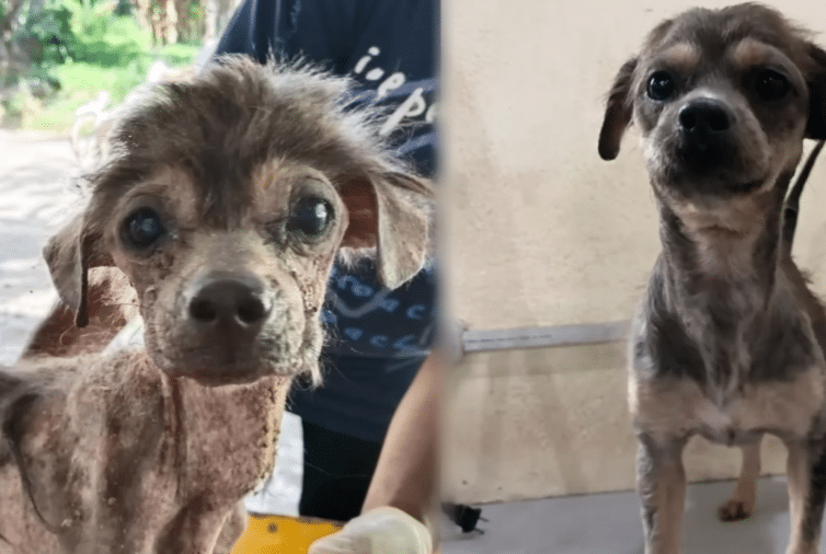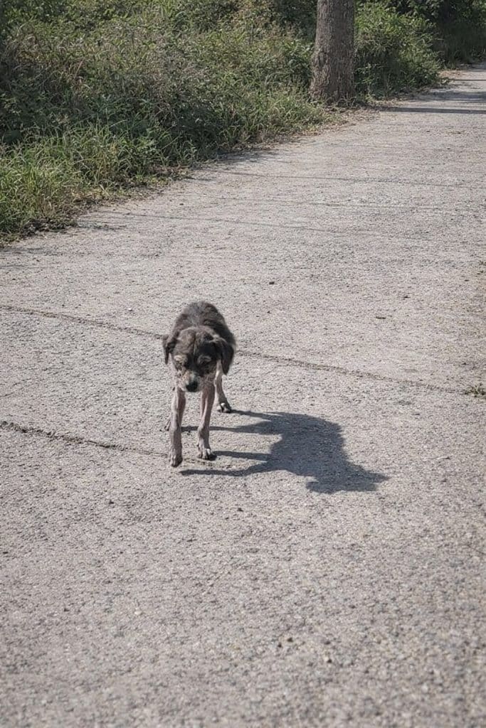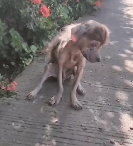 He simply stood there — painfully thin, his body reduced to skin and bone. Most of his fur had fallen away due to severe mange and prolonged malnutrition. His frame looked fragile, almost weightless.