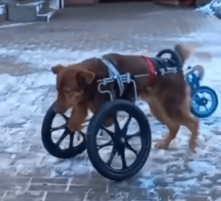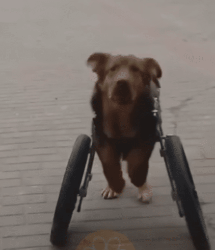 The footage captures the extraordinary moment when a dog once confined by injury begins discovering movement in a completely new way.
