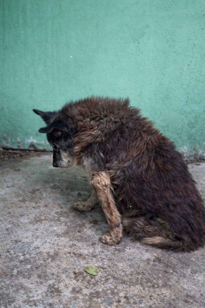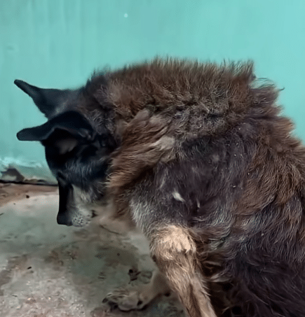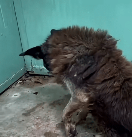 An elderly dog — thin, patchy-coated, clearly unwell — had wandered into the stairwell of an apartment building. He chose a quiet corner near the wall and stayed there.